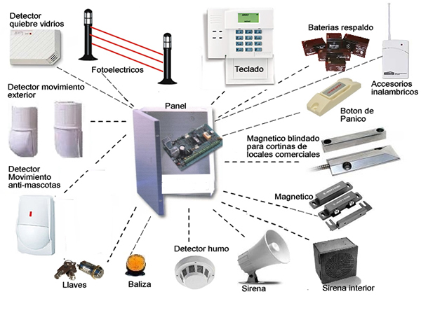 Los sistemas de alarma se componen, normalmente, de una central, un teclado, avisadores acústicos y/u ópticos y por último un determinado número de detectores en función de las necesidades del cliente determinada en la inspeccion. Estos detectores suelen ser volumétricos (detectan intrusión dentro de un volumen o estancia), siendo la tecnología infrarroja la más utilizada por su fiabilidad y economía. Otros detectores volumétricos más sofisticados son los de doble tecnología, que combinan la detección infrarroja con la microondas, debiéndose producir ambas detecciones de forma simultánea para provocar alarma. Esta característica le confiere una mayor dureza de detección en ambientes de riesgo, por lo que normalmente se han venido instalando en dichos ambientes (garajes, bancos, oficinas). Otro tipo de detectores para instalar en nuestro sistema de alarma pueden ser de acción perimetral, tales como contactos magnéticos para puerta o ventana, detección inercial de rotura de cristal (impacto), detección por barrera infrarroja o microondas de exterior y cable enterrado o de valla. Podrá obtener documentación técnica de todos los equipos mencionados comunicandose con el departamento tecnico para una buena asesoria.